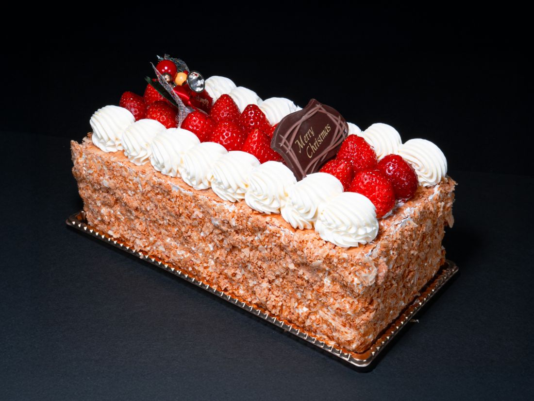 オンバケーションの看板・ナポレオンパイをX'mas用に作りました。サクサクのパイとたっぷりの生クリームとイチゴを使用!ご要望があればカットしてお渡ししますのでお気軽に!
